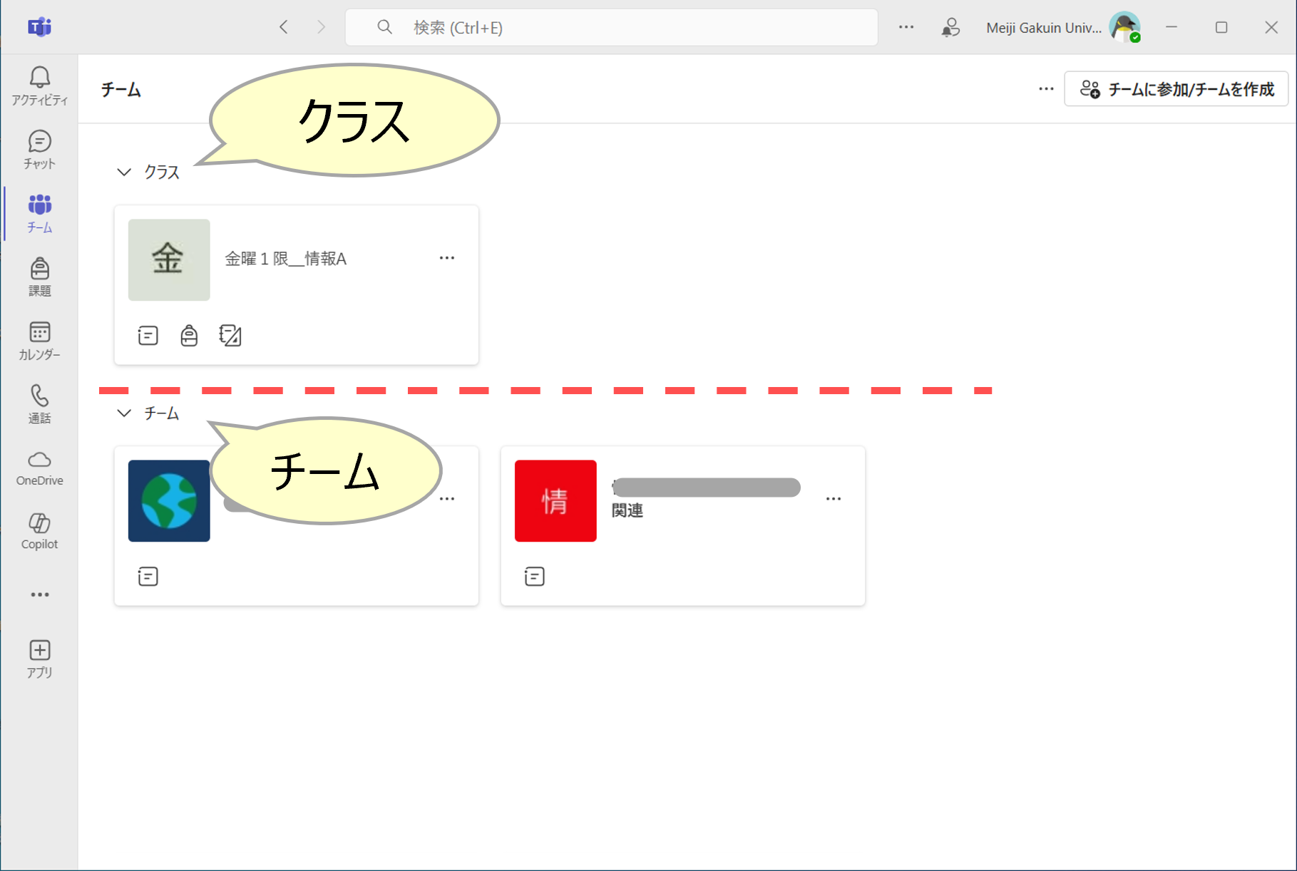 - 本学のTeamsには一般的な【チーム】の他、授業用のテンプレート【クラス】があります。