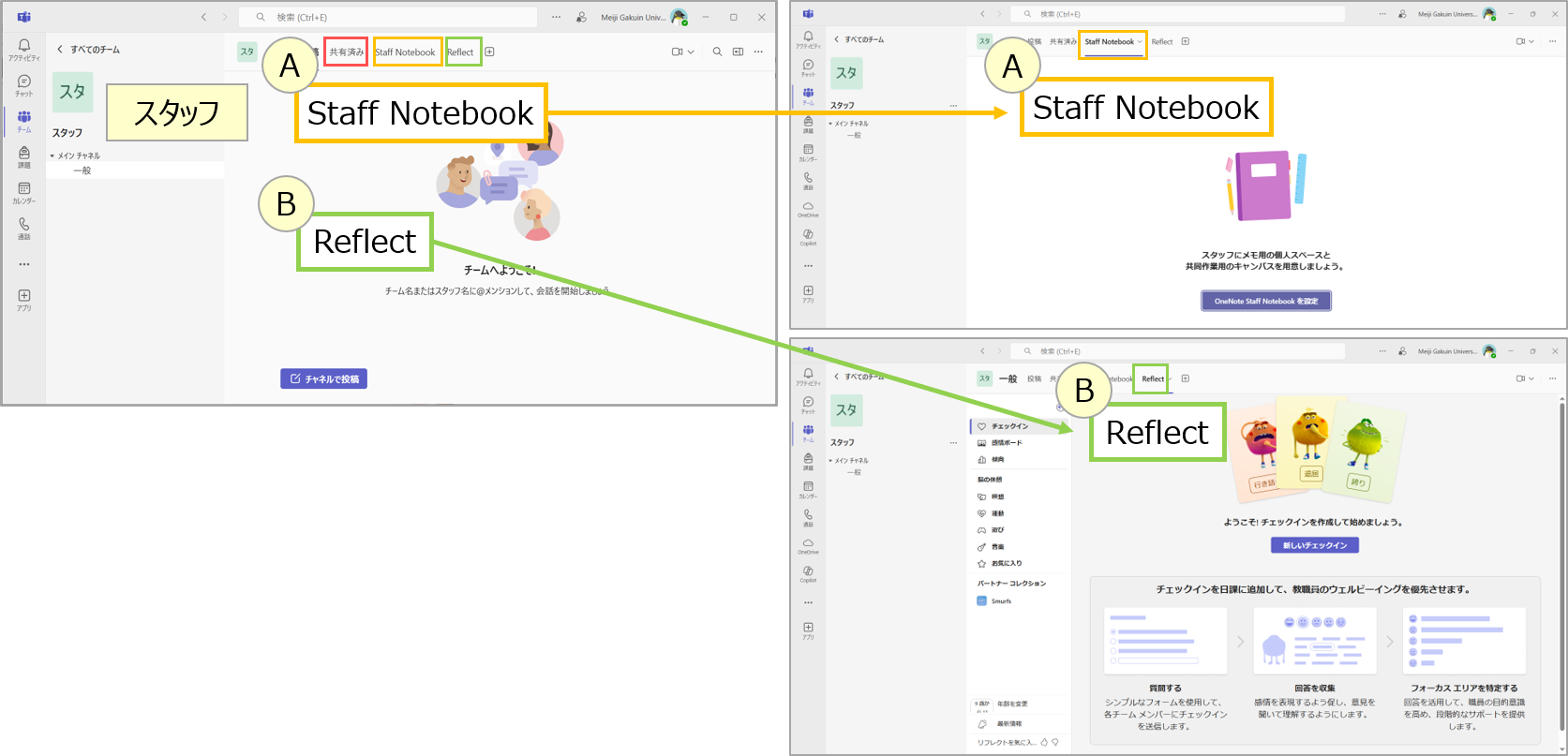 | 2 | スタッフ ●学校の管理と開発 | スタッフ リーダーはスタッフ チームの所有者で、他のユーザーをメンバーとして追加します。 各スタッフ チームでは、コミュニケーションを取ったり、重要なドキュメントを共有したり、共通の管理目標を追跡するためにスタッフ ノートブックを設定したりすることができます。 ◆Staff Notebook / Reflect |