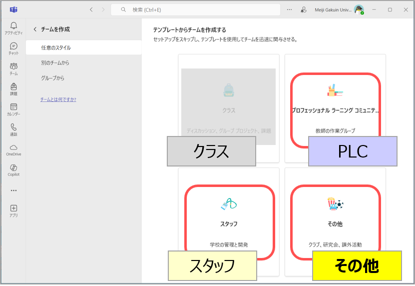 - 教育機関向けのチームには、授業用の【クラス】の他に、【PLC】【スタッフ】【その他】の3種類のテンプレートが用意されています。作成方法は同じです。