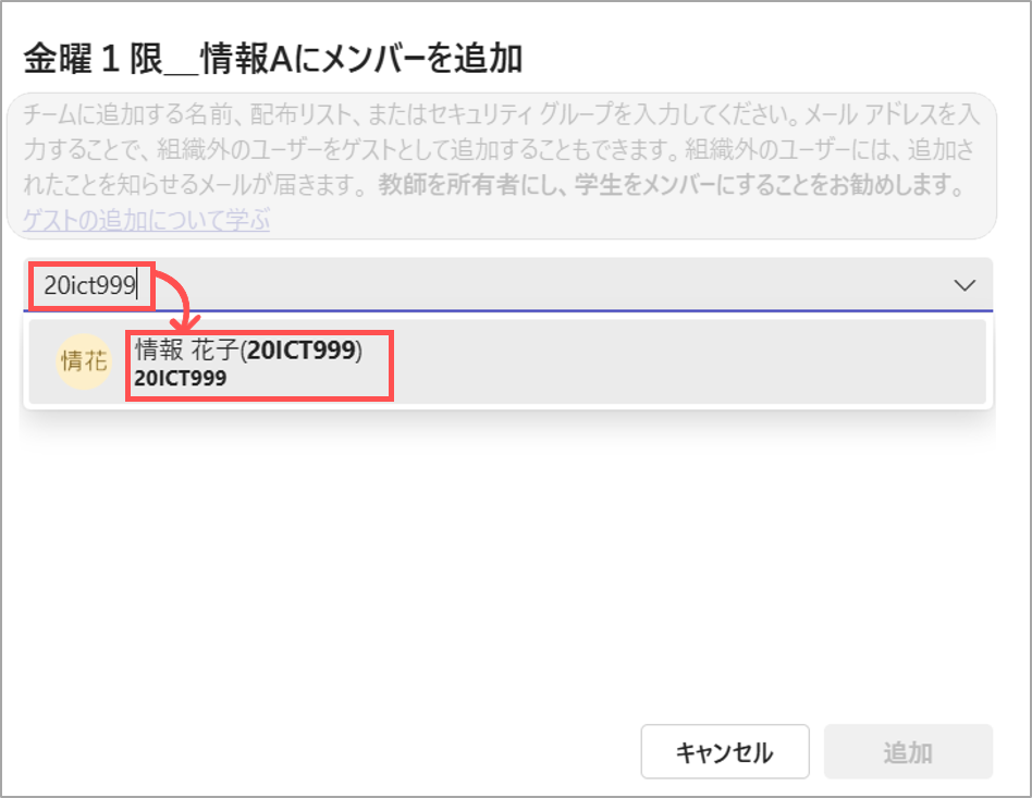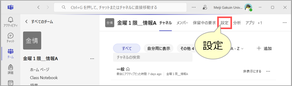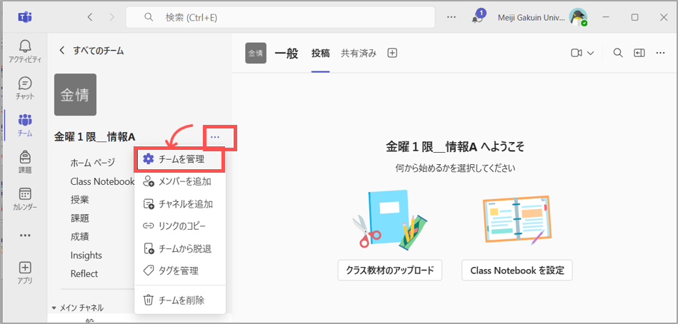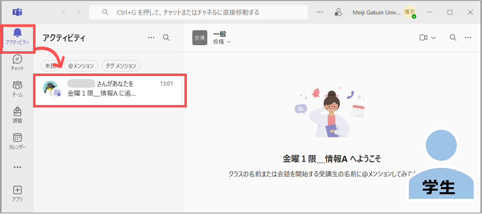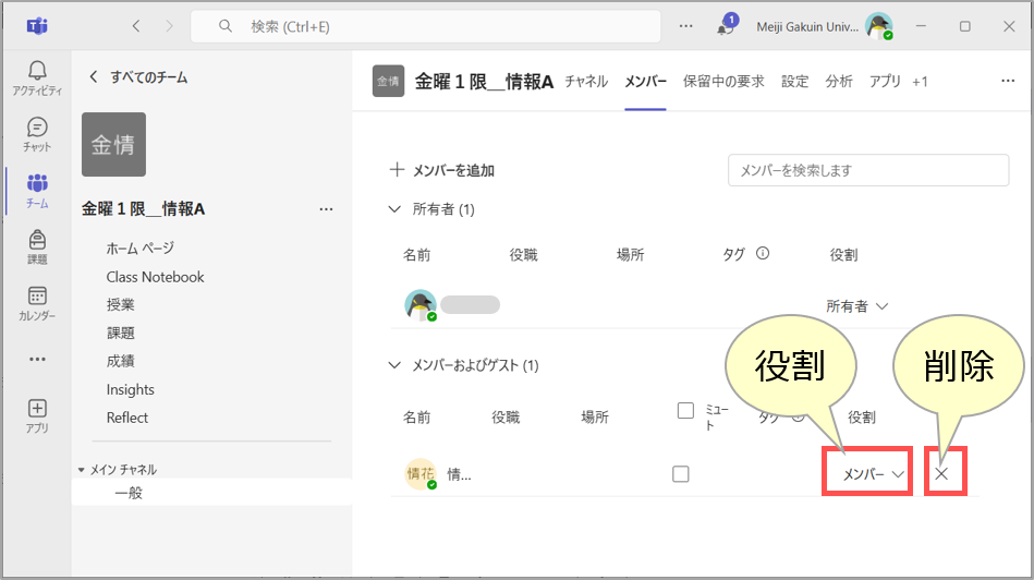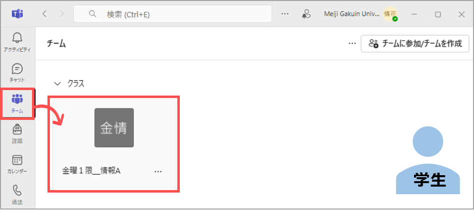 • 本学のTeamsでメンバー登録できるのは、本学のアカウント(@meijigakuin.ac.jp)のみです。