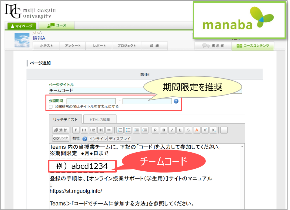 3.manabaのチームコードを貼り付け