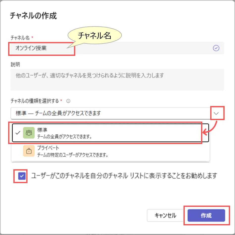- 標準チャネル:チーム全員がアクセス可