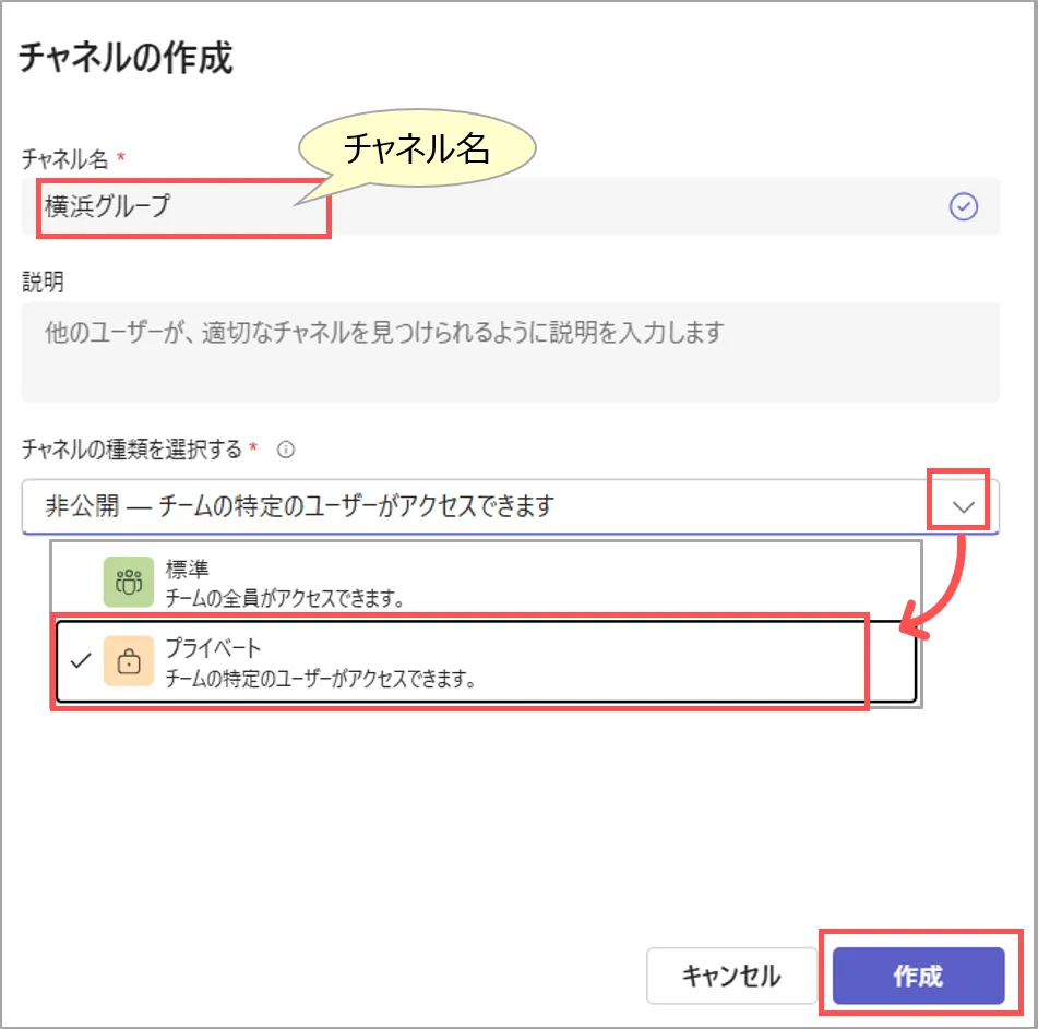 - チーム内に特定のグループを作成したいときは【プライベート チャネル】を作成します