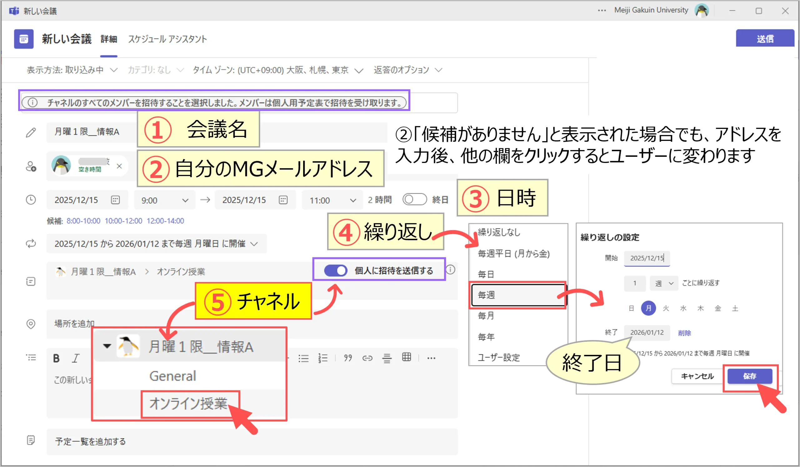 | Teamsカレンダー上での表示 | チャネルメンバーは「会議名」 | 主催者、アドレス登録者は「予定あり」 |