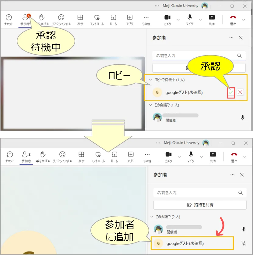 • 【入室を許可できる人】が「許可」するまでロビーで待機。不審な参加者の入室を防ぐことができます。