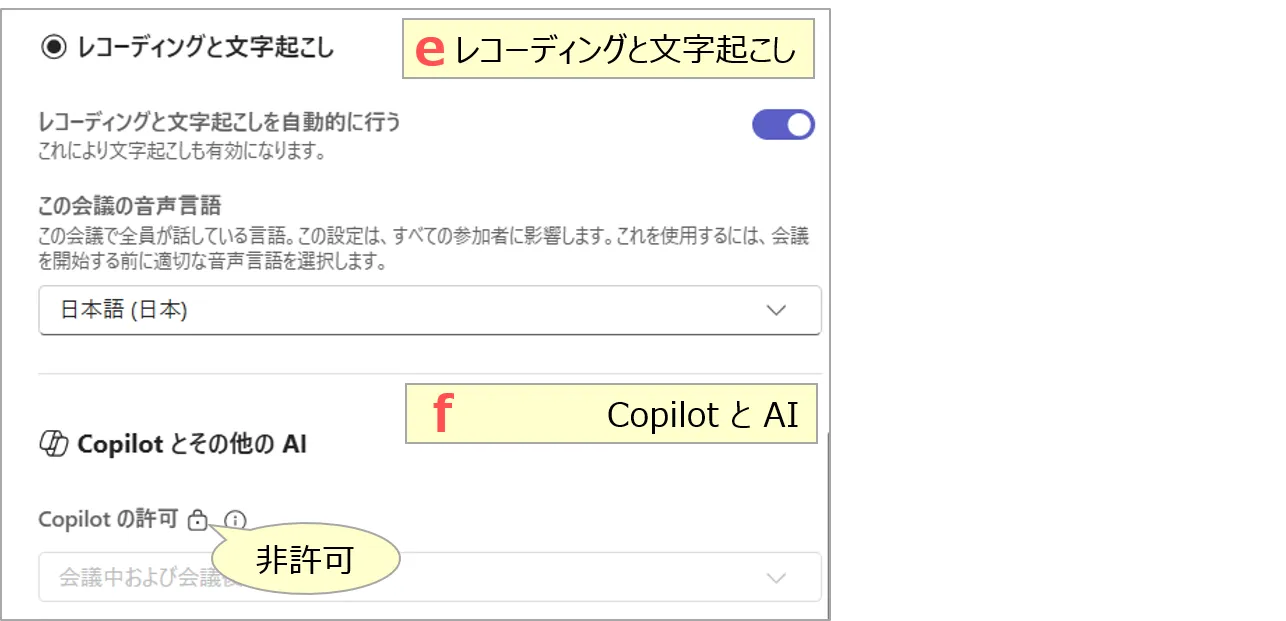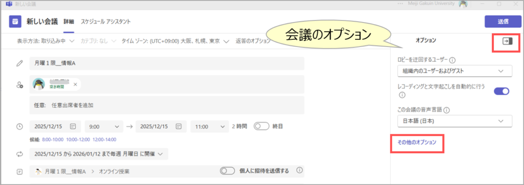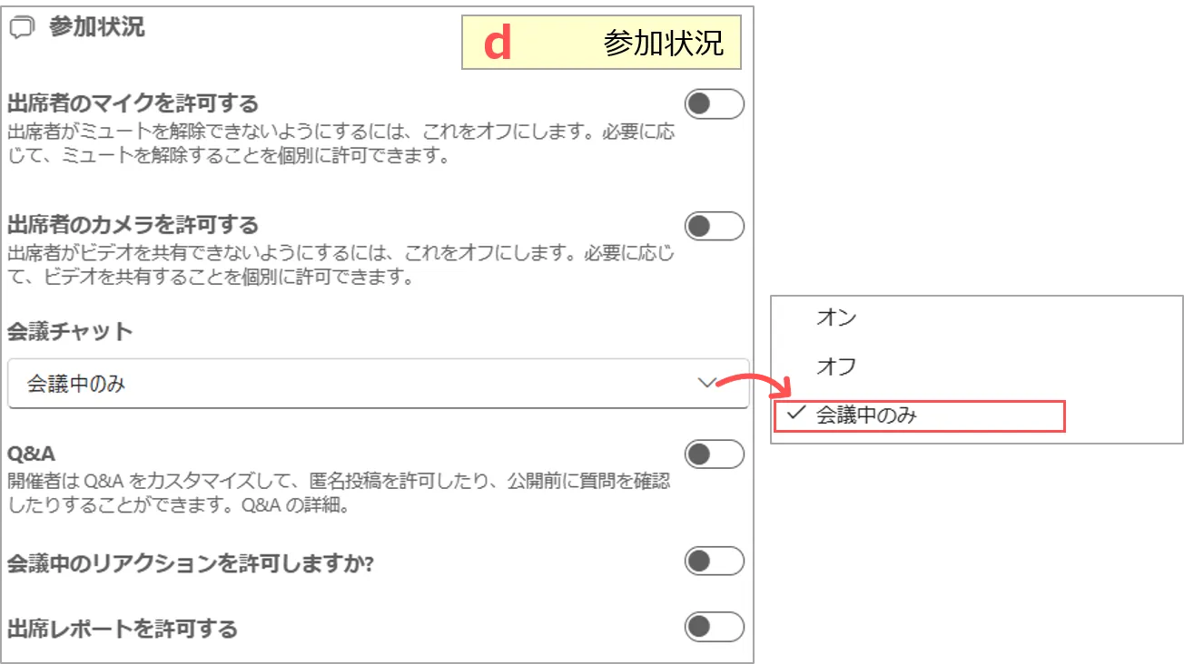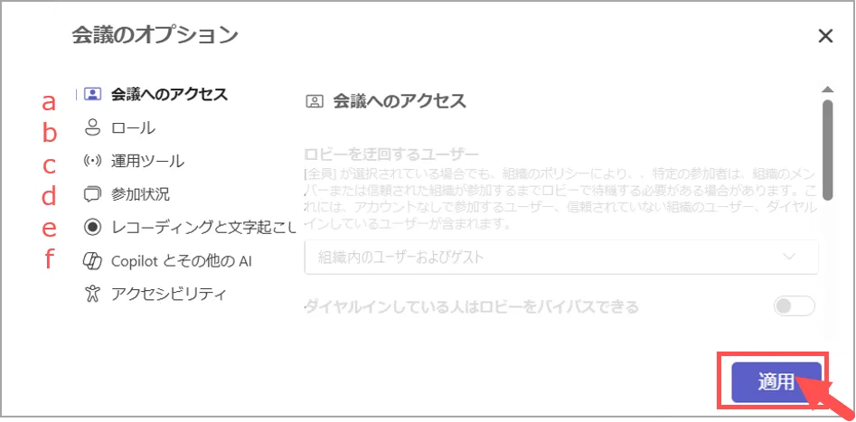 • 会議のオプションは、会議への参加方法と、会議中の役割などの設定です。この設定は会議中にも変更できます