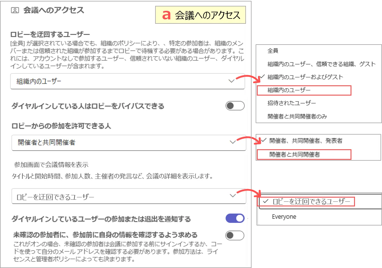 • 主に組織外のユーザーなどが直接会議に参加できないよう、会議のセキュリティ強化のために使用します。
