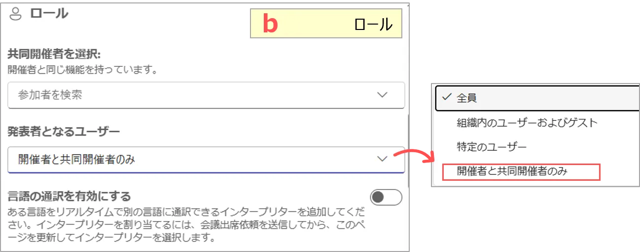 • 講義型の授業では、授業のアシスタントは、共同開催者に設定し、発表者の選択は「開催者と共同開催者」とし、