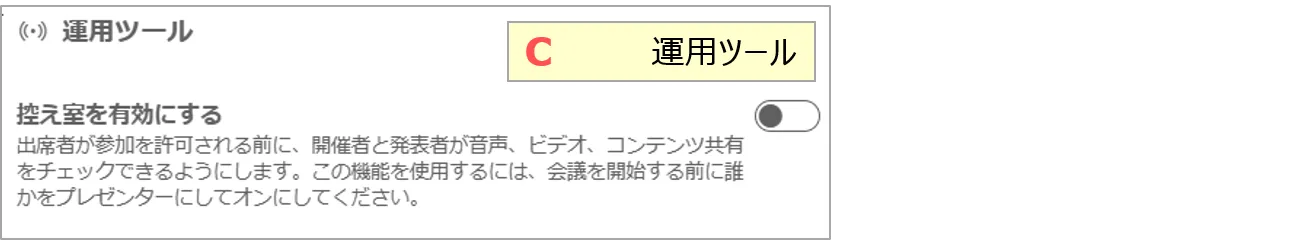 • ユーザーが会議に参加しようとしたとき「待機中」と表示される一時的な待機場所です。