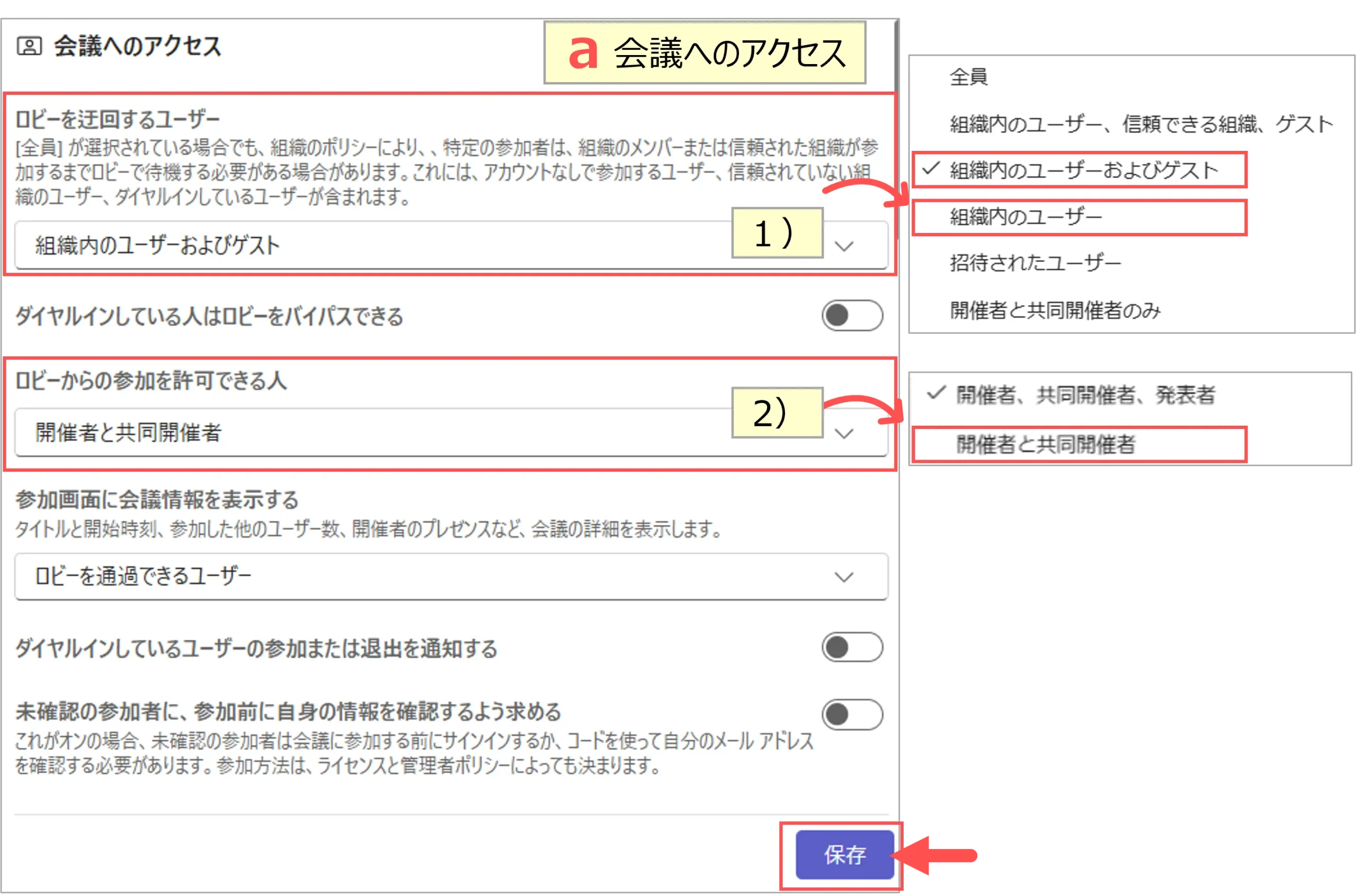 - 会議のオプションは、会議への参加方法と、会議中の役割などの設定です。