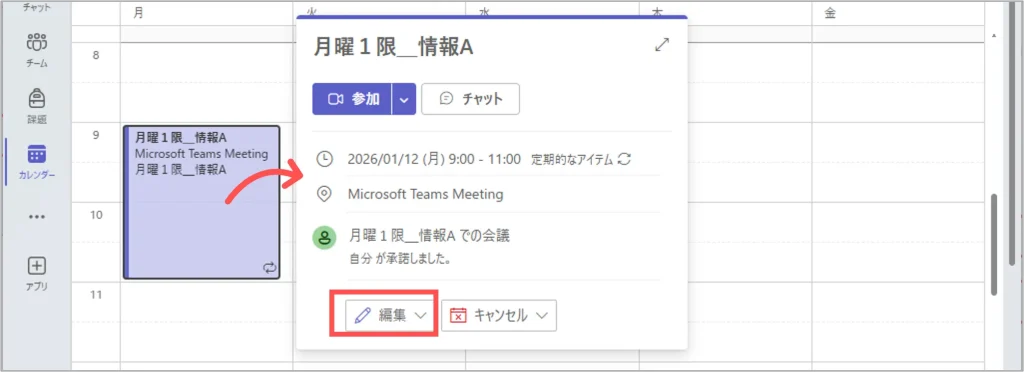 ※録画の際、画面に表示された参加者情報は、編集により削除できません。 - 会議情報(URL)をmanabaに掲載することにより、参加者を「履修者」としています。