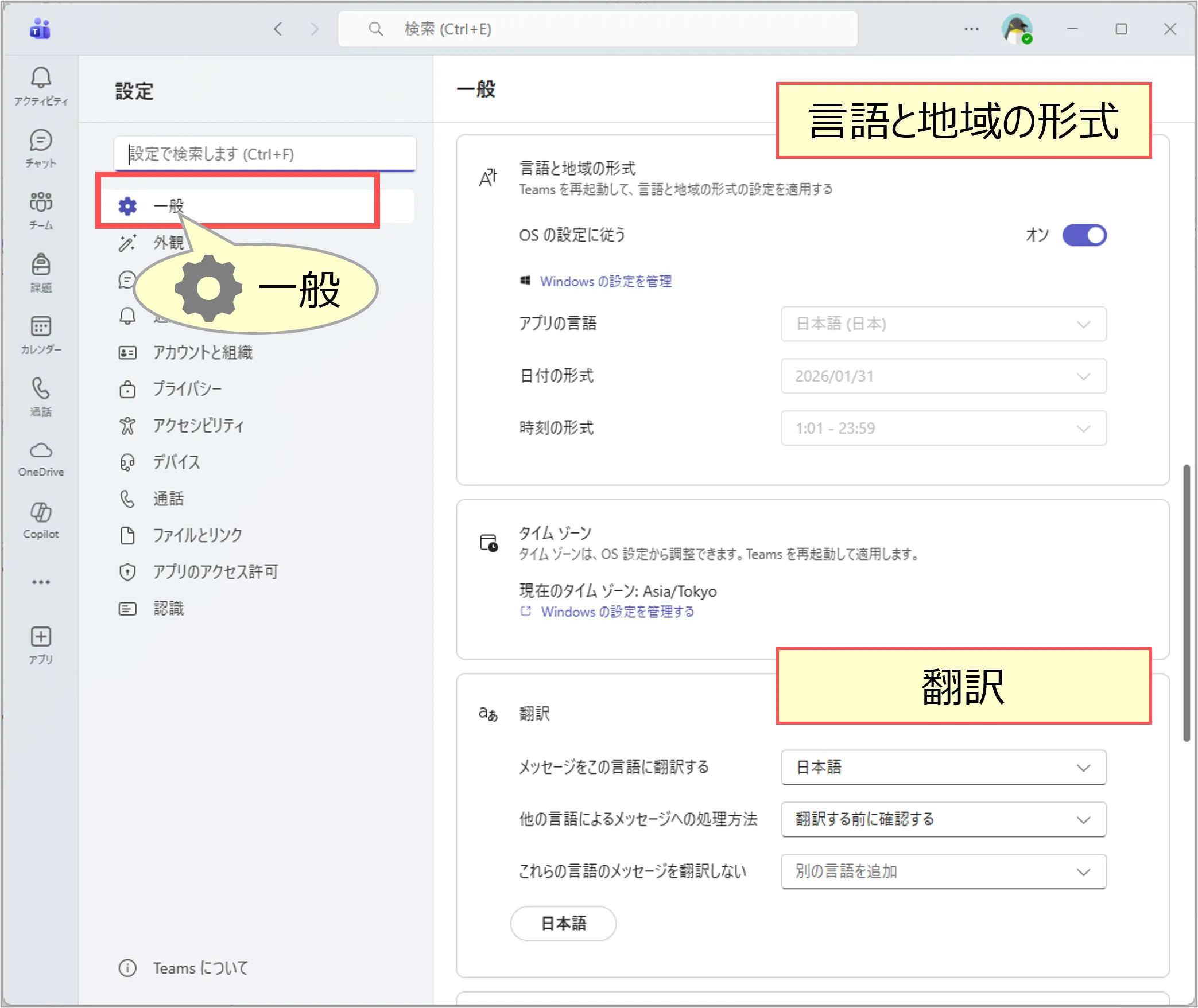 ▶「マニュアル ( Teams )」へ 「言語」等の設定はこちらから。任意で変更してください。※基本的にMGメール(Microsoft Exchange)の設定に準じています。 A)アプリから開く B)ブラウザ版から開く ■ 言語関係の設定 1.「一般」をスクロール 言語と地域の設定 翻訳 ▲Topへ 更新:2026/01