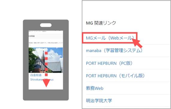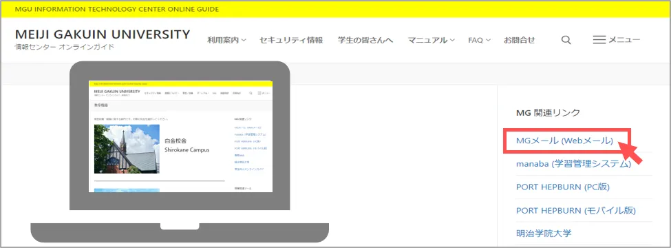 - MGメールは、本学のWebメールシステムです。インターネットに接続しているパソコンやスマートフォンで、学内外を問わずメールの送受信ができます。