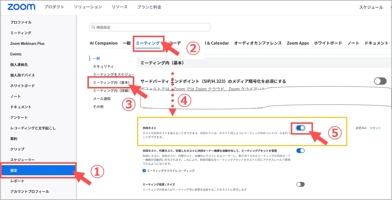 - 無料ユーザーの場合は、共同ホストの設定やクラウド録画等の制限があります