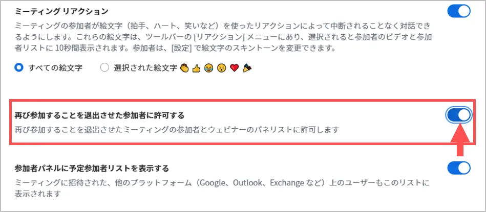 - 「再び参加することを退出させた参加者に許可する」をONにします