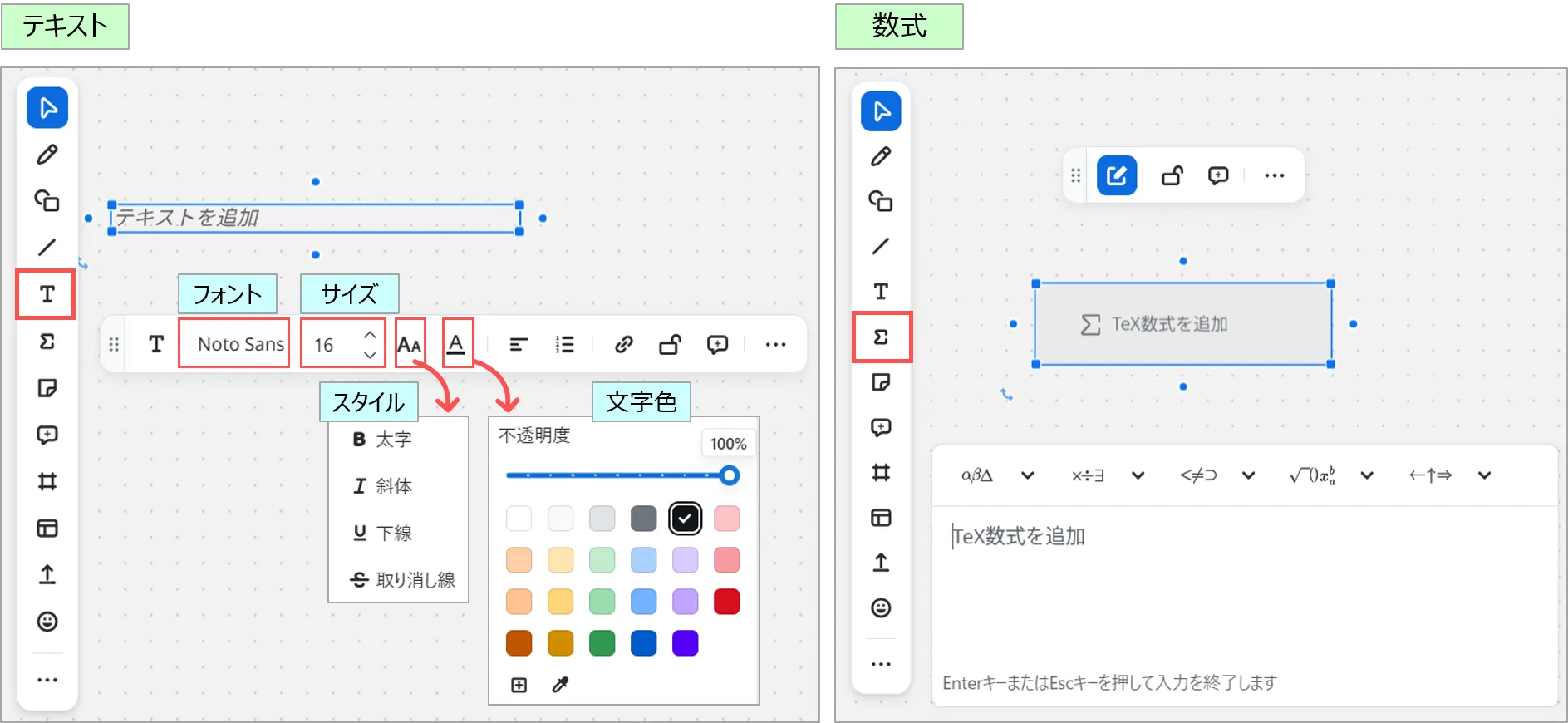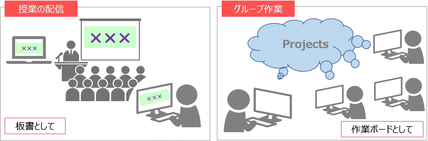 | メリット | ● 教室でもオンラインでも、参加者がクリアに閲覧ができる ● パソコンと黒板の行き来がなく、進行がスムーズ | ● 参加者は、それぞれのデバイスから書き込むことが可能 ● ブレーンストーミングの議事録などに最適 |