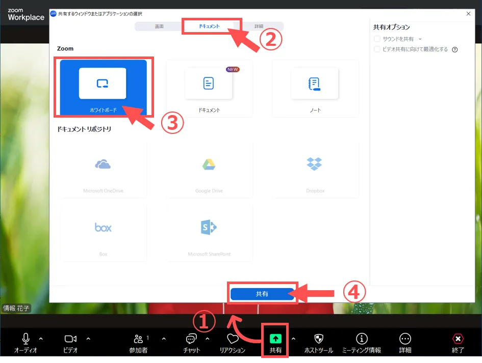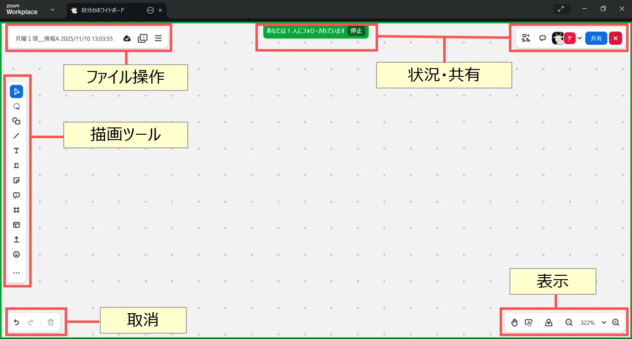 - Zoomの「画面共有」には、板書の代替として利用できる「ホワイトボード機能」があります。