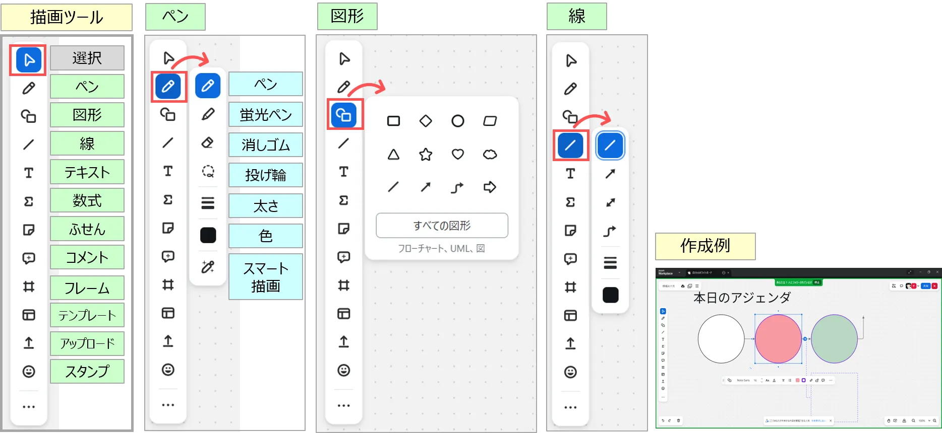 - 矢印や図形など、用意されたツールで直感的に書き込みができ、テキスト入力も簡単です。