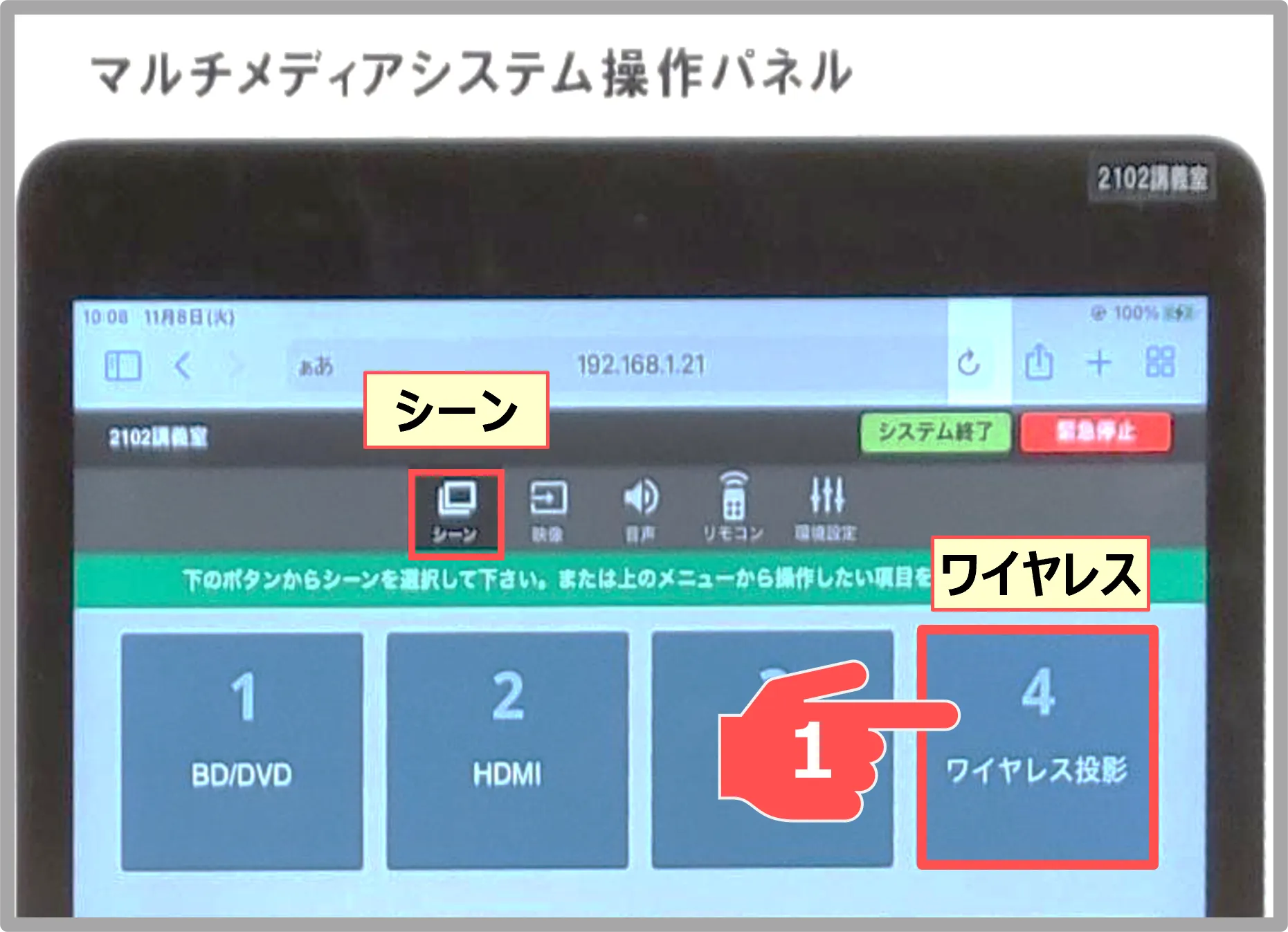 - 操作パネルの 【ワイヤレス投影】 をタップします