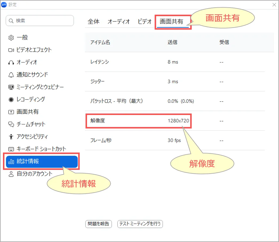ミーティングの実行中に、Zoomの【統計情報】画面で解像度を確認することができます。