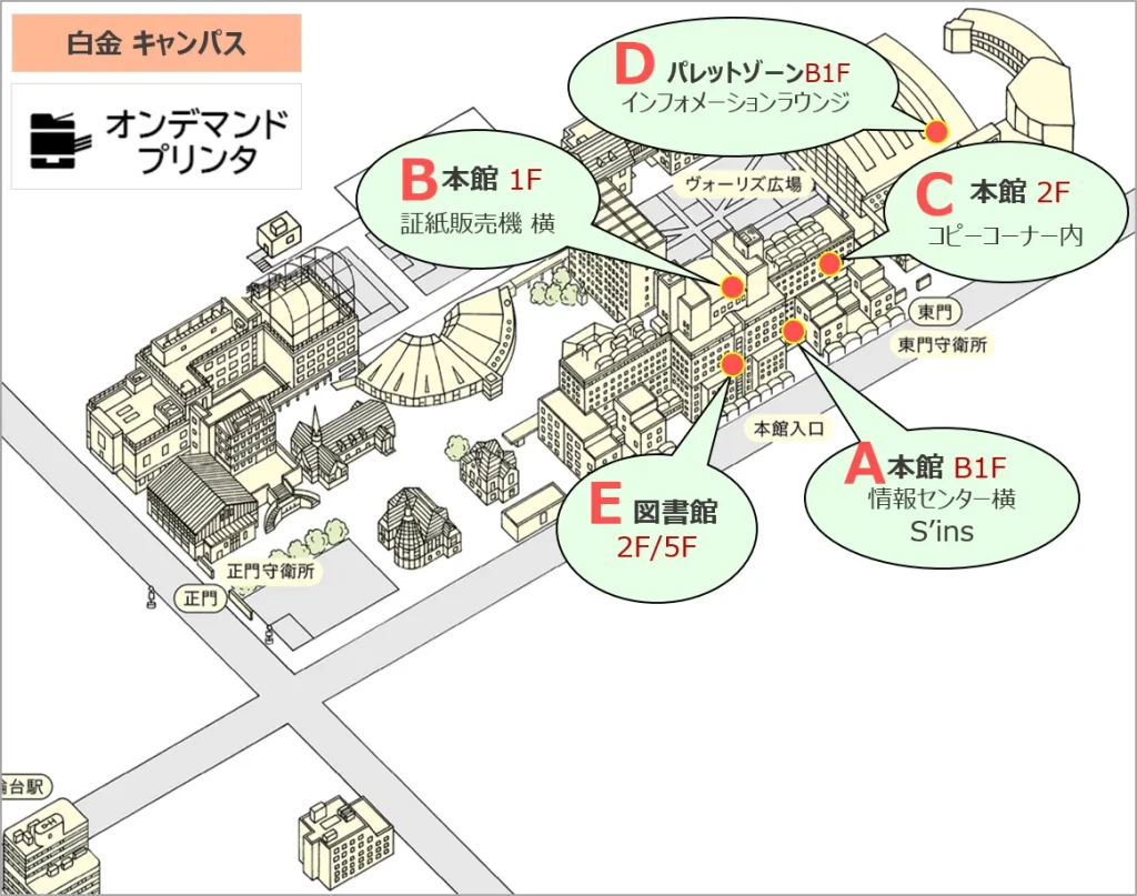| A B C | 本館 | B1F 1F 2F | 情報センター横 S’ins 内 証紙販売機 横 コピーコーナー内 |