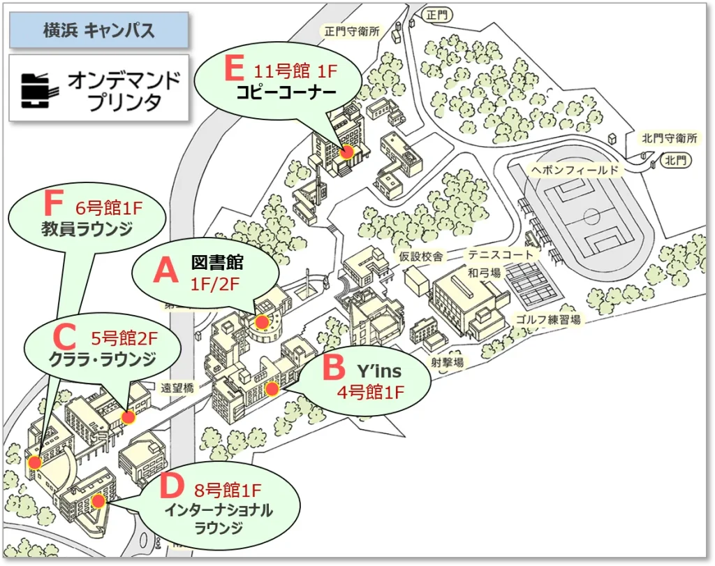 | E | 11号館 | 1F | コピーコーナー カラー x 1、モノクロ x 1 |