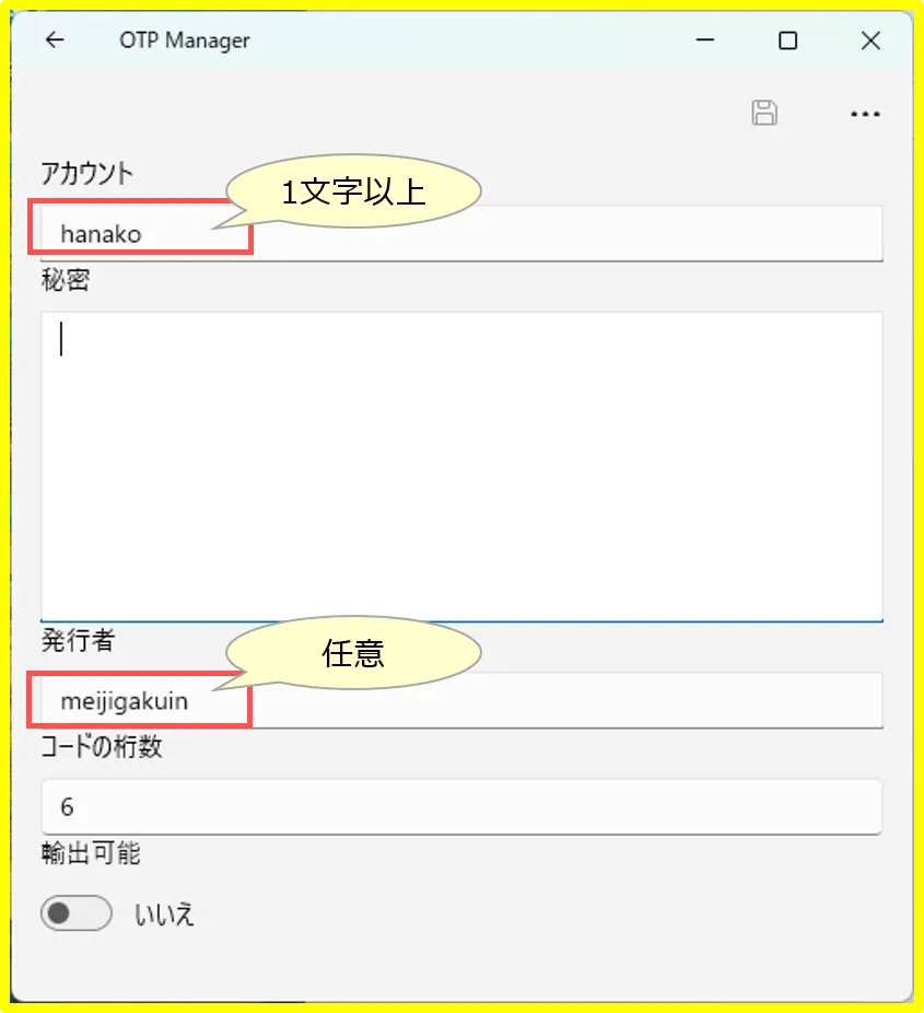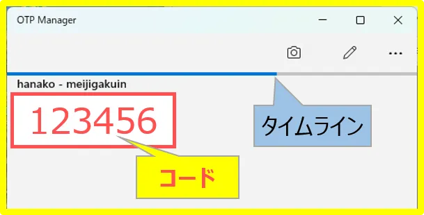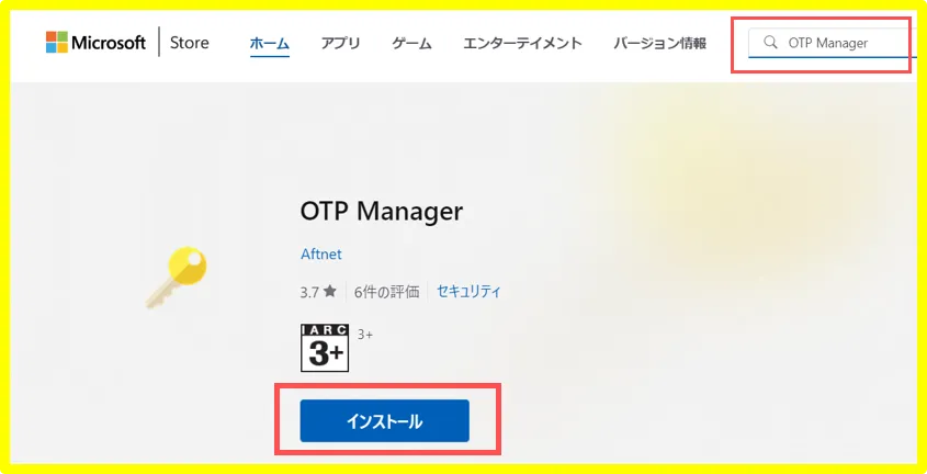 3. アプリ(OTP Manager):黄色い枠で表示