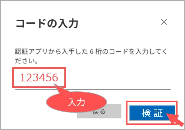 4.認証画面に【コード】を入力し「検証」をクリック