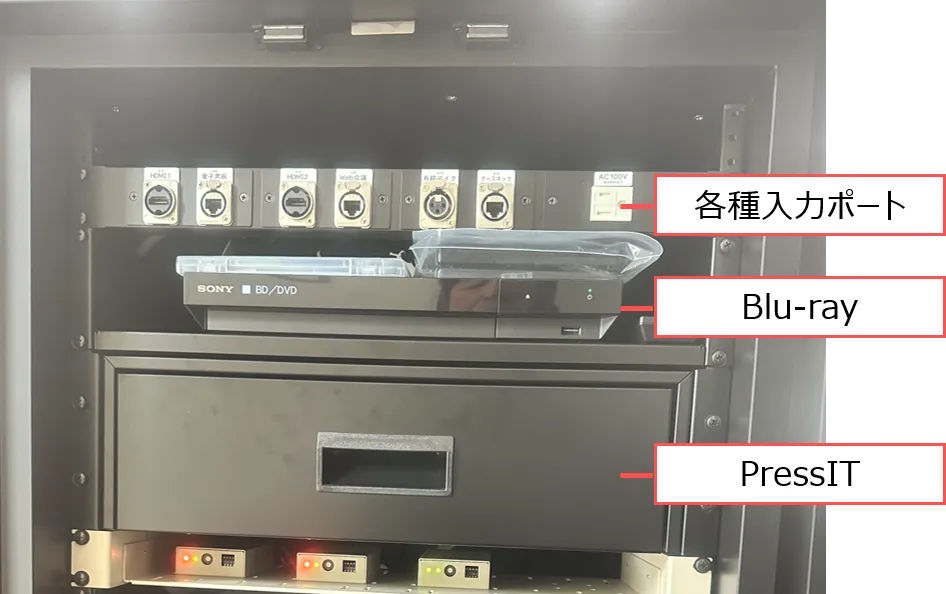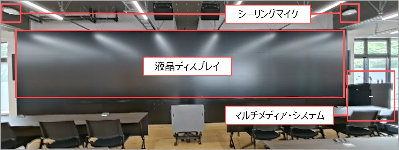 ワイヤレスマイク(2本)有線マイク(1)卓上マイク(1) ピンマイク(2本)、シーリングマイク | ラック内:XLR型(1か所) | 音声:MediaPort 映像:天井カメラ |
